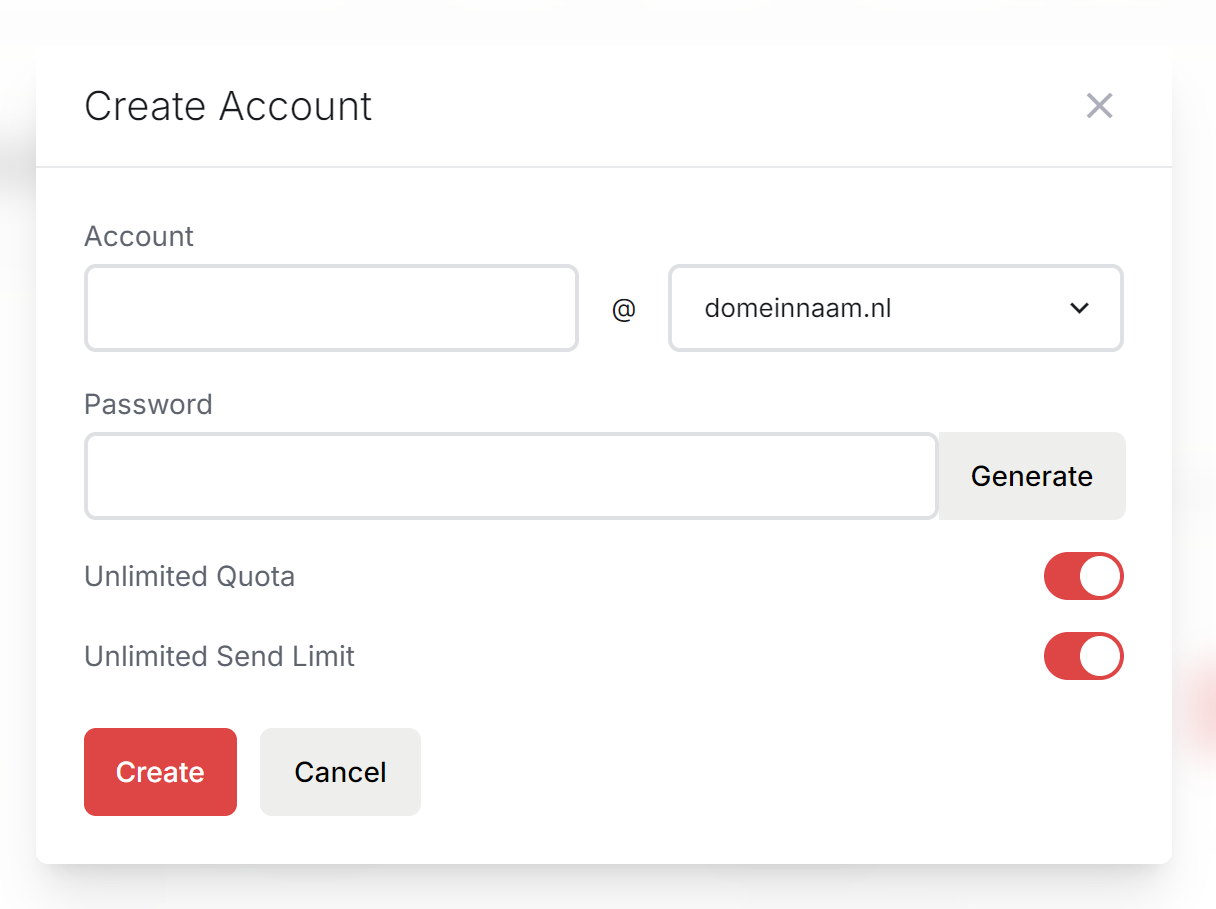 - Passwort: Das Passwort, das Sie für das E-Mail-Konto festlegen möchten. Unter Generieren können Sie auch ein sicheres Passwort festlegen.