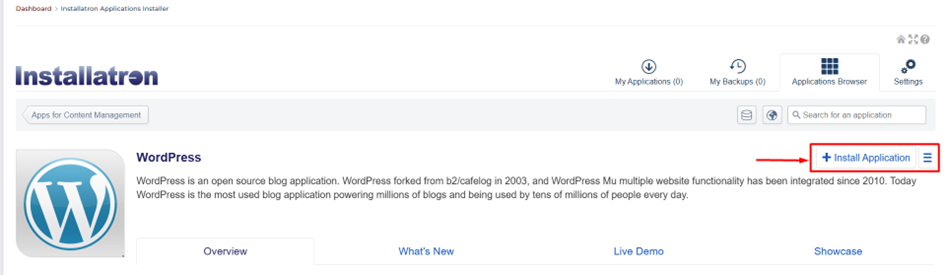 - Je ziet nu het installatie scherm van Installatron, klik vervolgens op: Install Application aan de rechter kant: